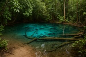 Первая остановка – Изумрудный бассейн (Emerald Pool), природное озеро с кристально чистой водой посреди тропического леса. Здесь можно искупаться и сделать красивые фотографии среди дикой природы.